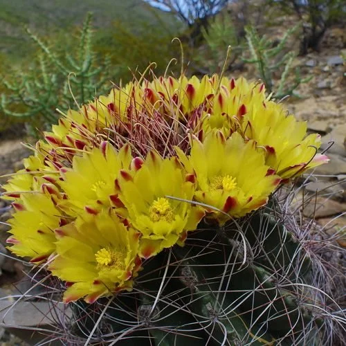 Pertenece al género Ferocactus y en Estados Unidos se conoce como ´Cactus Barril´ en alusión a su forma redonda y combada cuando alcanza su edad adulta.