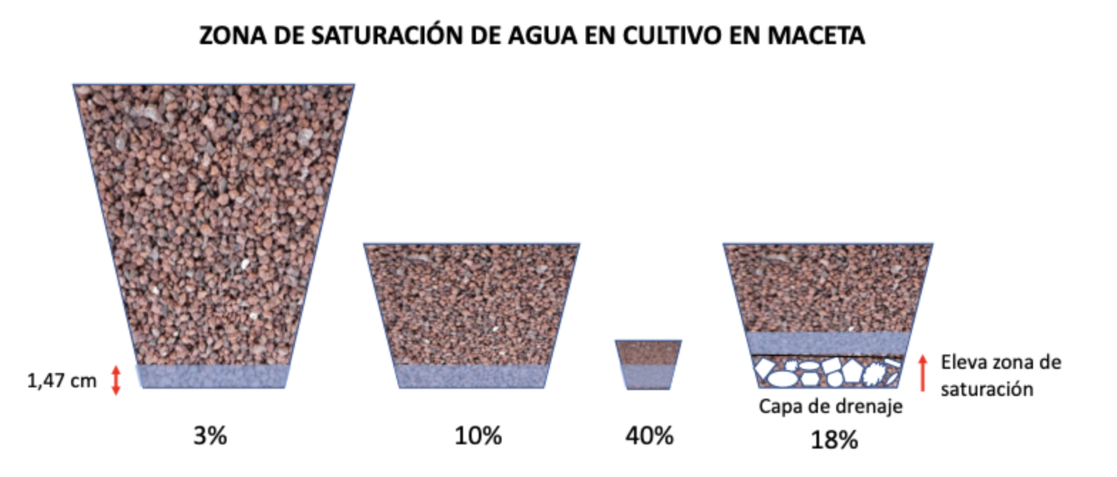 En un sustrato con una porosidad alta cercana al 80% la altura que va a ocupar esa zona de agua atrapada va a ser de unos 1,47 cm. SIEMPRE. Si la porosidad disminuye la altura de la zona de saturación es mayor. En la imagen gráfica ves que usando el mismo sustrato con una porosidad del 80% para distintos tamaños de maceta tendremos más agua en proporción con todo el volumen que ocupa el medio de cultivo en los tamaños más pequeños. Esto nos da pie a reflexionar que quizá: